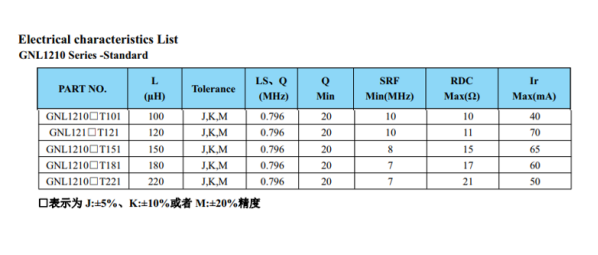 GNL1210J221貼片電感的參數:感值:22uH±5%,阻值:21mΩ,電流50mA。如下圖: